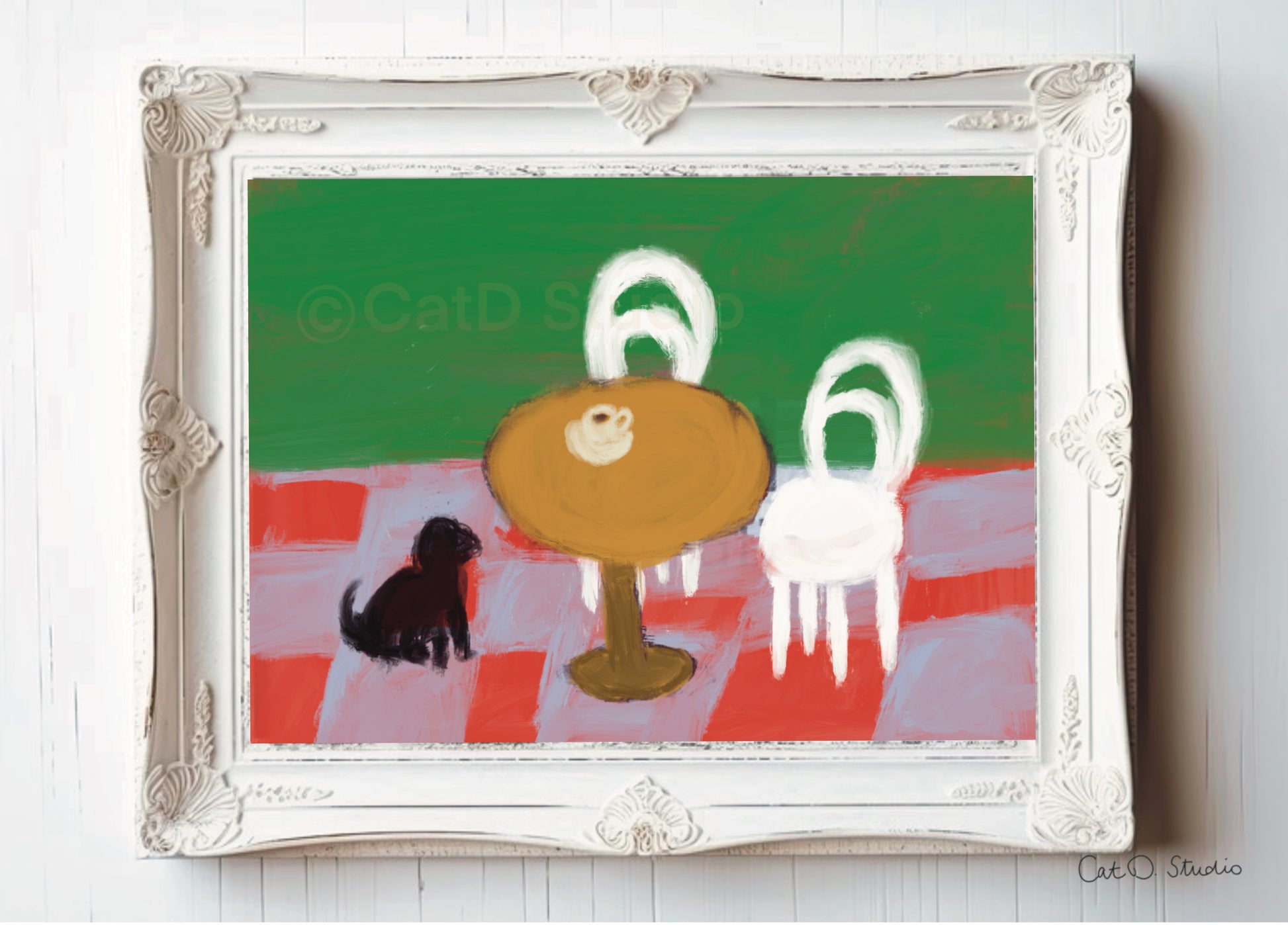 I once took my puppy to a café and accidentally left him there. This is a painting of that memory. Available as a fine art print with archival inks on heavyweight cotton rag textured paper (320gsm).