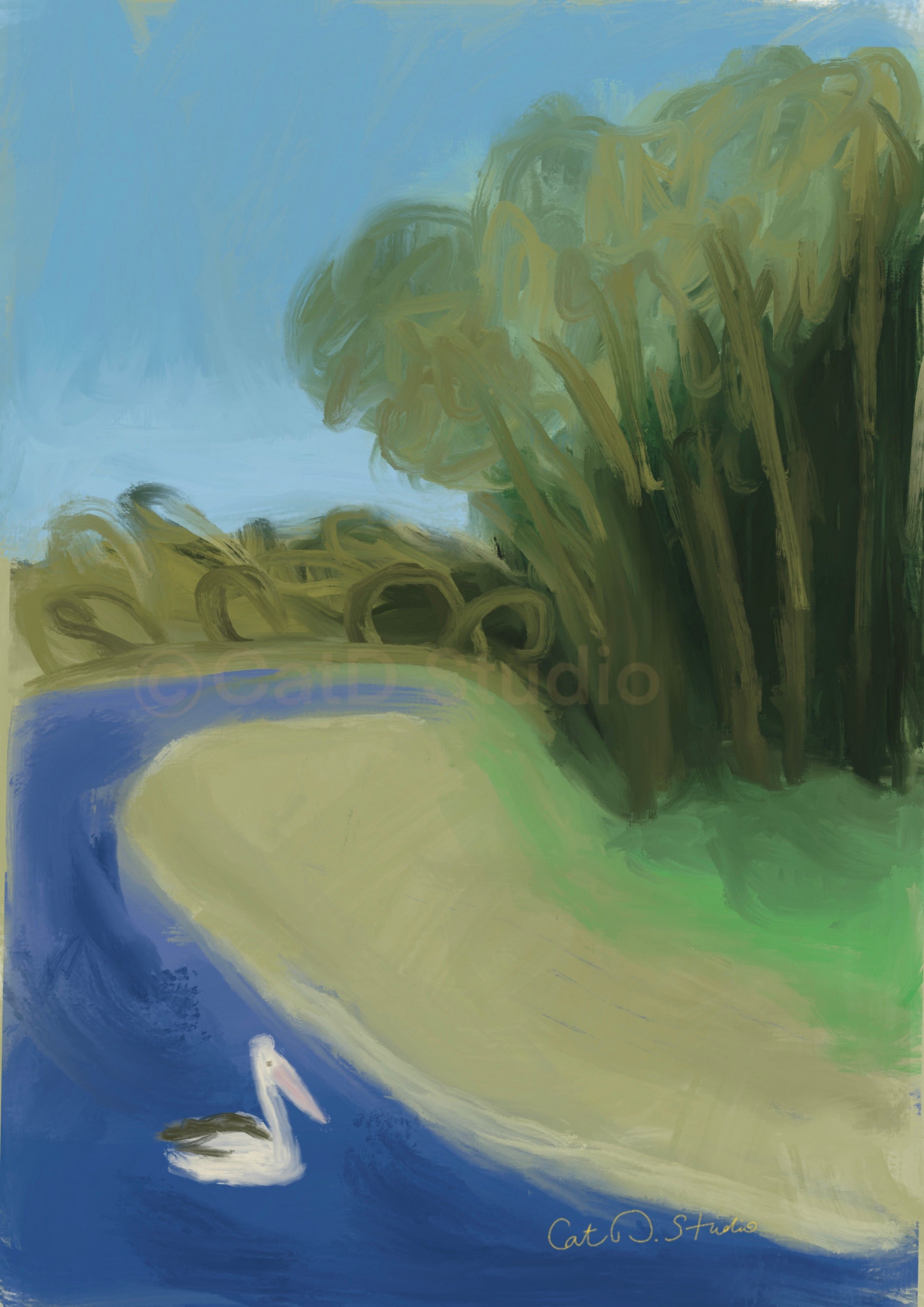 With one small dot of paint to create the eye, the charisma of a pelican is perfectly captured. I painted this most likeable of water foul at the shoreline of Nambucca River.