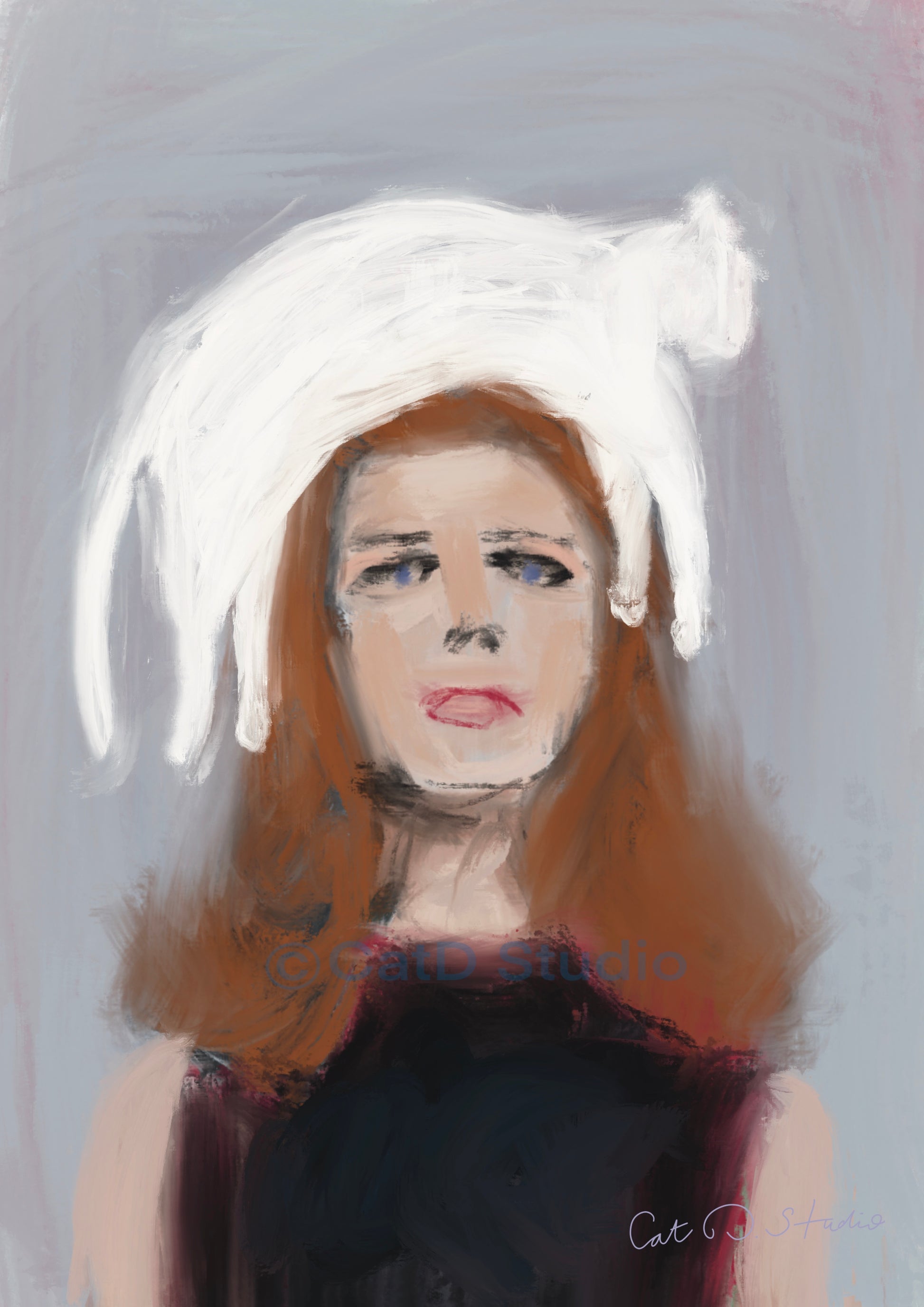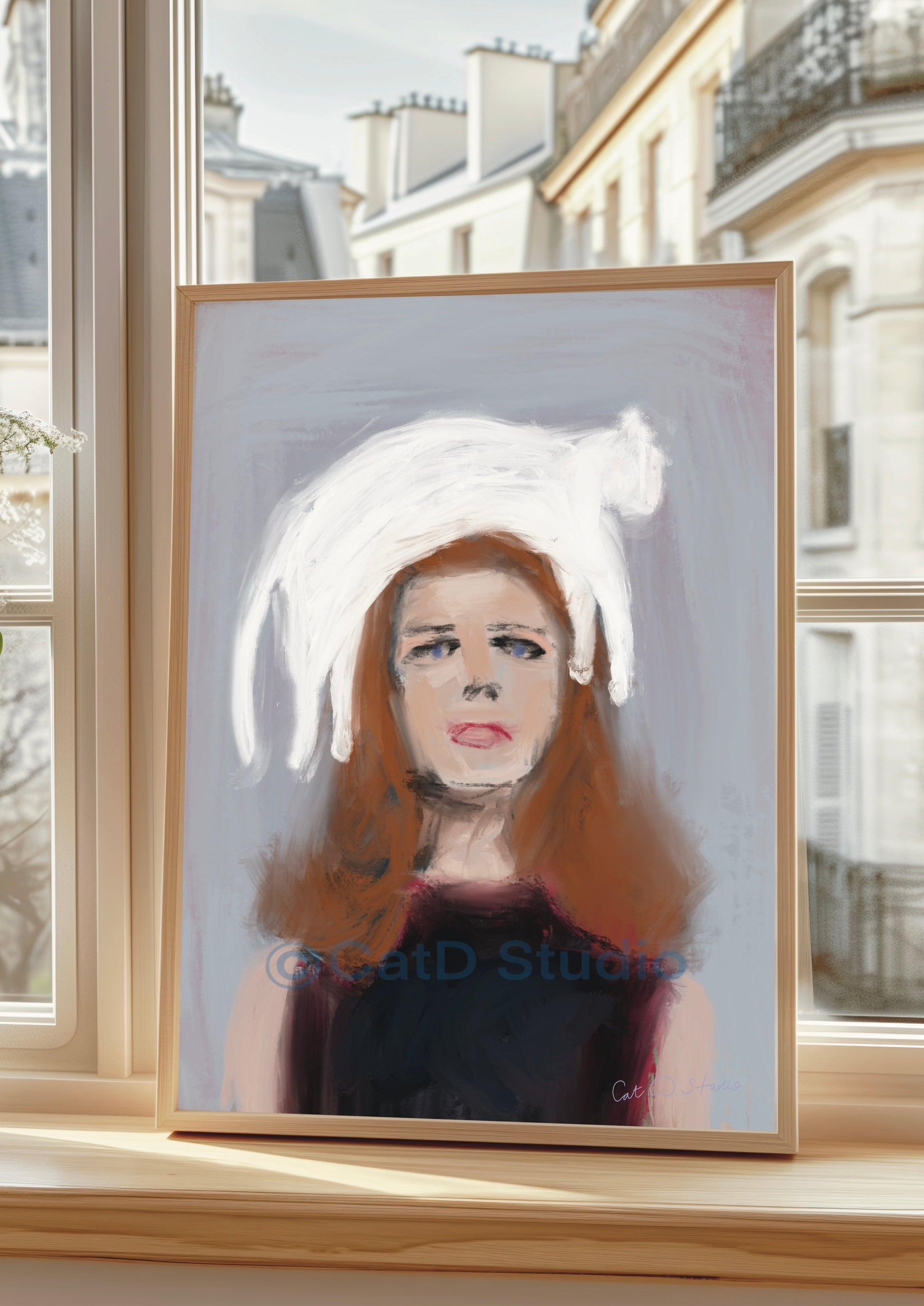 Every woman needs their own personal kitty on their head, a warm and slinky co-conspirator. This original painting created on Procreate is part of a series of cat and other animal friends atop the female mind.