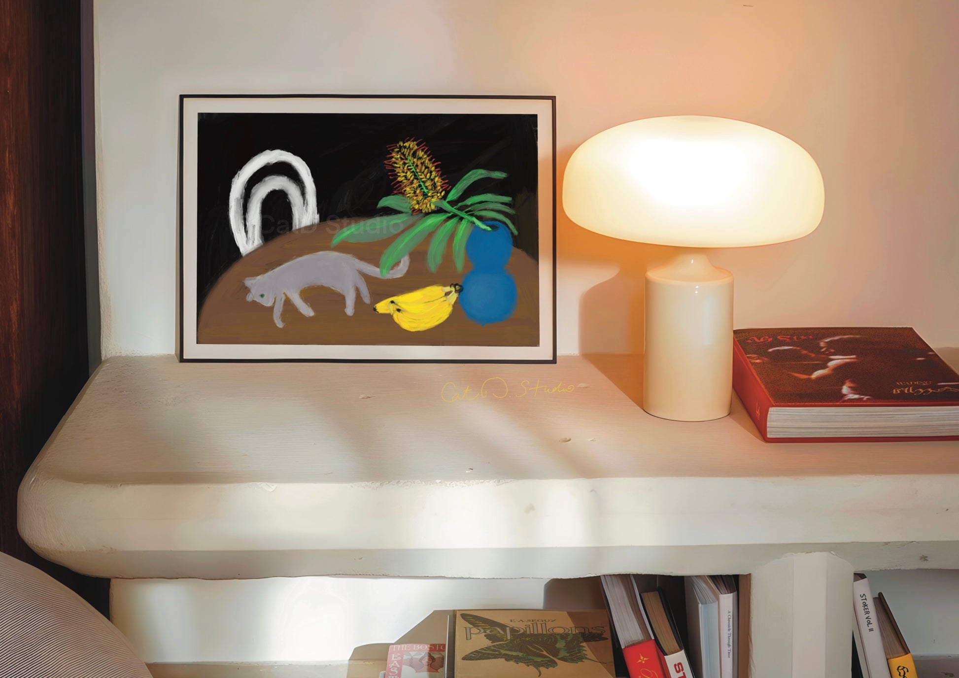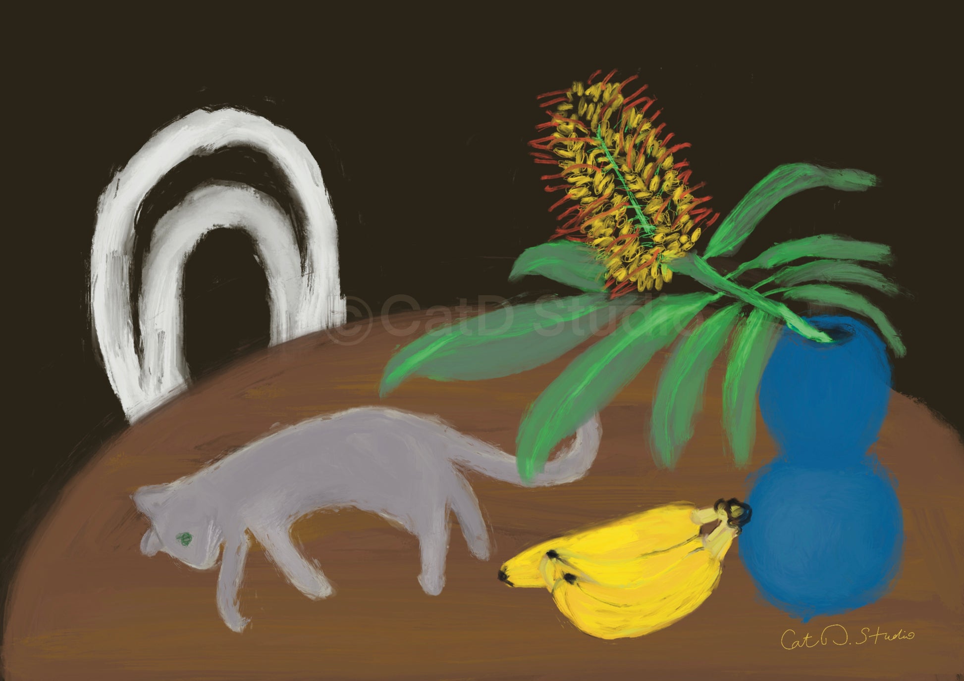 Every table arrangement needs a slumbering feline. This digital painting is available as a fine art print with archival inks on heavyweight cotton rag textured paper (320gsm).